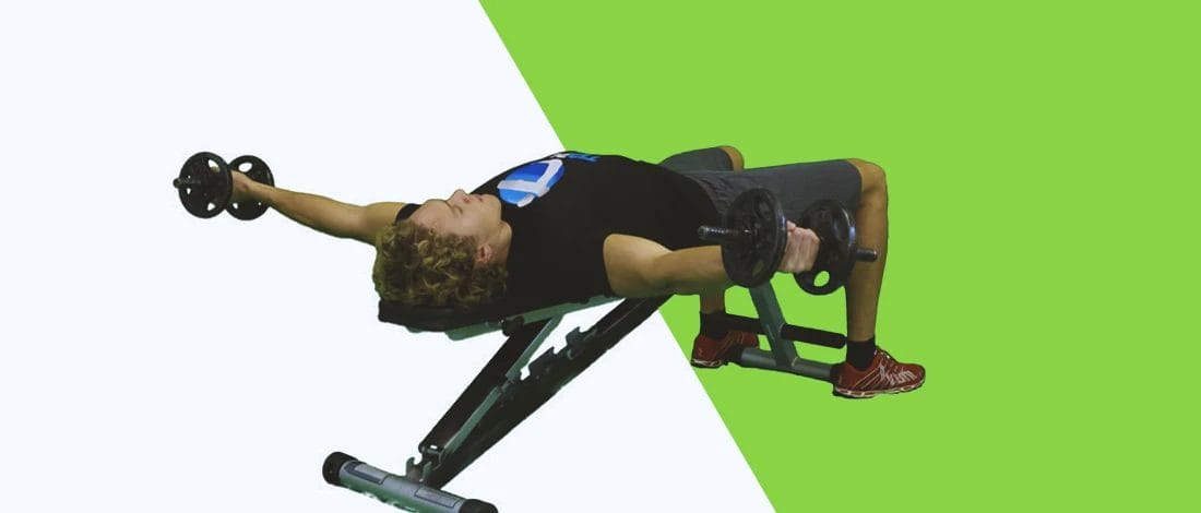- Begin by lying on a flat bench facing the ceiling with a dumbbell in each hand.